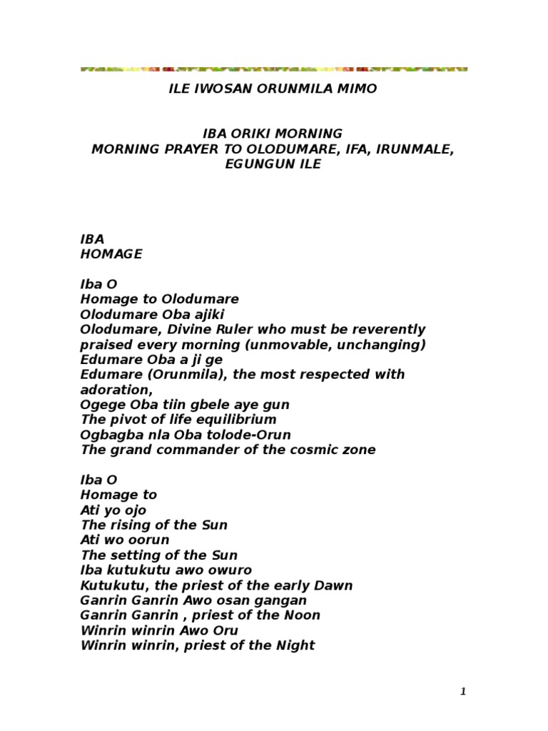 Lord, help me not to depend on my own understanding but in everything acknowledge you above all, so that you can direct my words. The prayer presented here is used as an opening invocation in many of the ceremonies performed by the elders of ifa in ode remo, nigeria. Below is an ifa morning prayer recitation: Thank you for my life, for drawing me to yourself and bringing me into your family, as a child of god. Dear lord, you have blessed me with a beautiful new day.