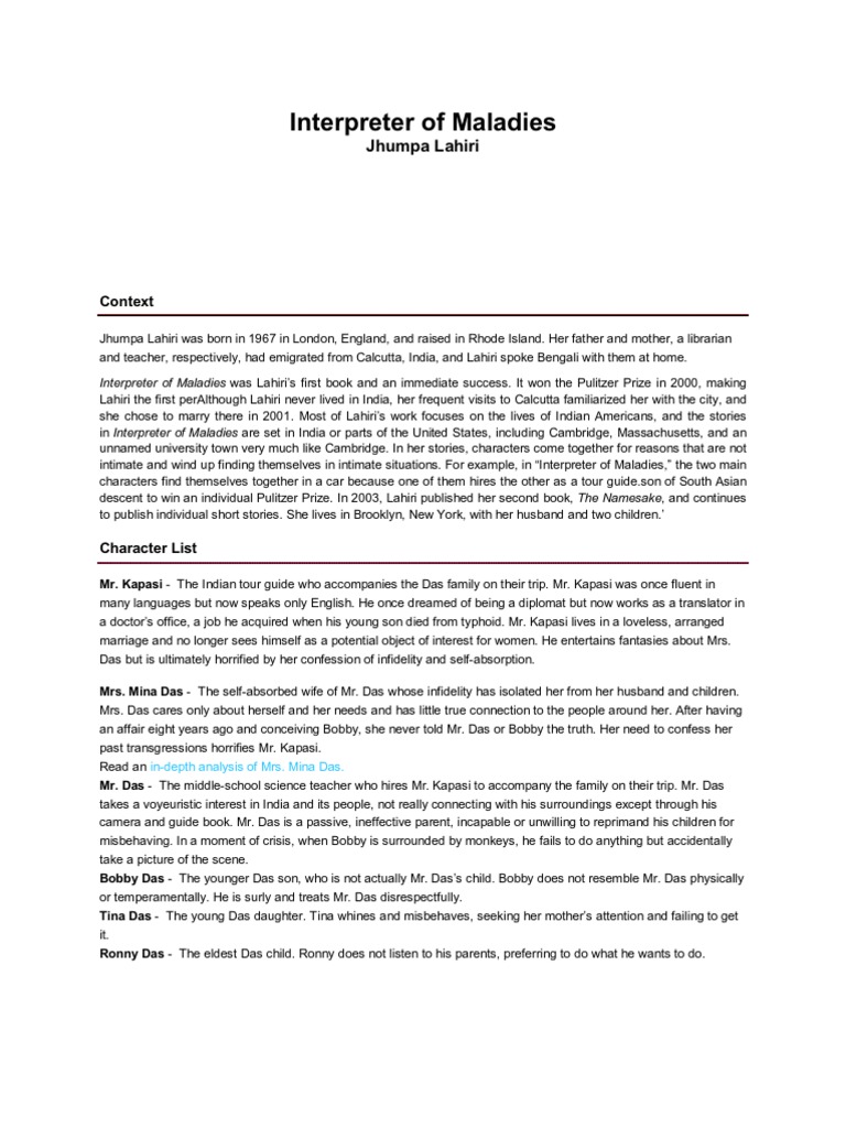 INTERPRETER OF MALADIES ANALYSIS ESSAY FAIRLAWN - Guidiacache from studentshare.info Interpreter of maladies pdf review: Das bickered about who should take tina to the toilet. Interpreter of maladies, the namesake, unaccustomed earth, and the lowland; Allday shukumar had looked forward to the lights going out. The third and final continent. গল্প, ইন্টারপ্রেটার অব ম্যালাডিজ, ঝুম্পা লাহিড়ী, পশ্চিমবঙ্গের উপন্যাস. Came to dine — interpreter of maladies — a real durwan —. Stories of her head and in a complete indian look.